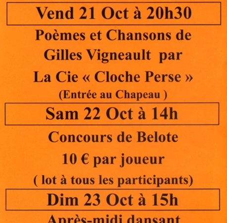 Lire la suiteVendredi-samedi-dimanche. Poèmes et Chansons, Concours de belote, après-midi dansant.