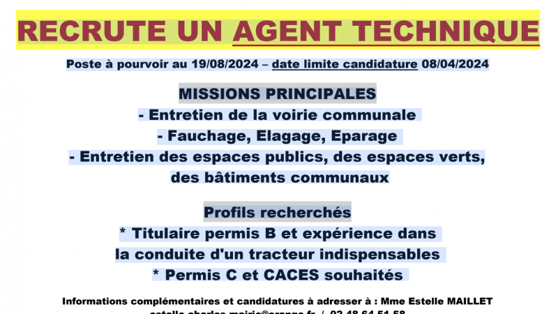 Lire la suiteLa commune de Saint Georges/Moulon recrute un agent technique. Poste à pourvoir au 19/08/2024 – date ...
