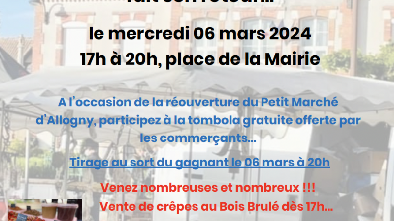 Lire la suiteLe mercredi 06 mars 2024 de 17h à 20h, ne manquez pas la réouverture de Petit Marché de notre village ...