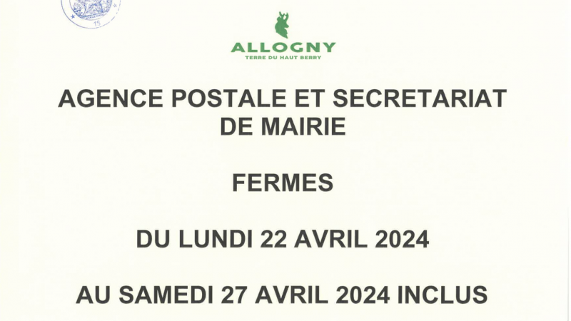 Lire la suiteVotre mairie et l’agence postale resteront fermées du lundi 22 avril 2024 au samedi 27 avril 2024 ...