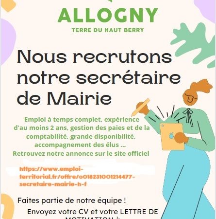 Lire la suiteNous recrutons notre secrétaire de Mairie, retrouver l’annonce sur : https://www.emploi-territorial.fr/offre/o018231001214477-secretaire-mairie-h-f