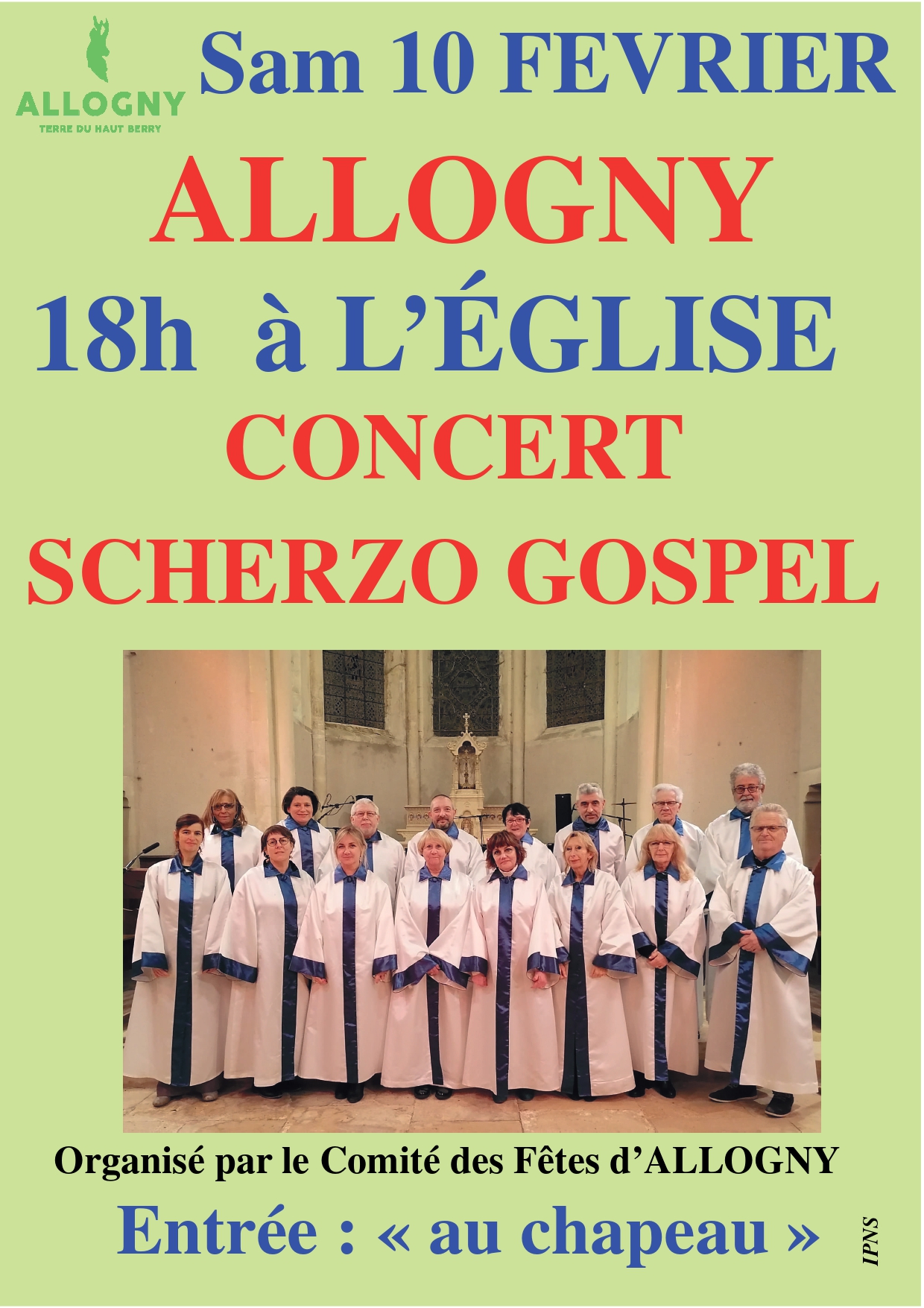 Le comité des fêtes d'Allogny vous convie à un concert Gospel le samedi 10 février à 18 H à l'église.