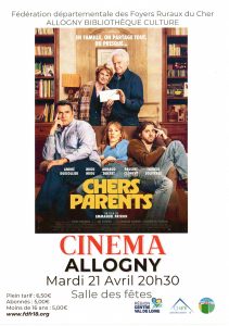 – Le mardi 21 avril Ă 20h30, projection du film « CHERS PARENTS », tarifs habituels (5 € pour les abonnĂ©s, 6,5€ pour les non-adhĂ©rents et 5€ pour les moins de 16 ans)