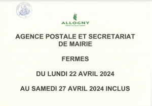 Votre mairie et l'agence postale resteront fermées du lundi 22 avril 2024 au samedi 27 avril 2024 inclu.