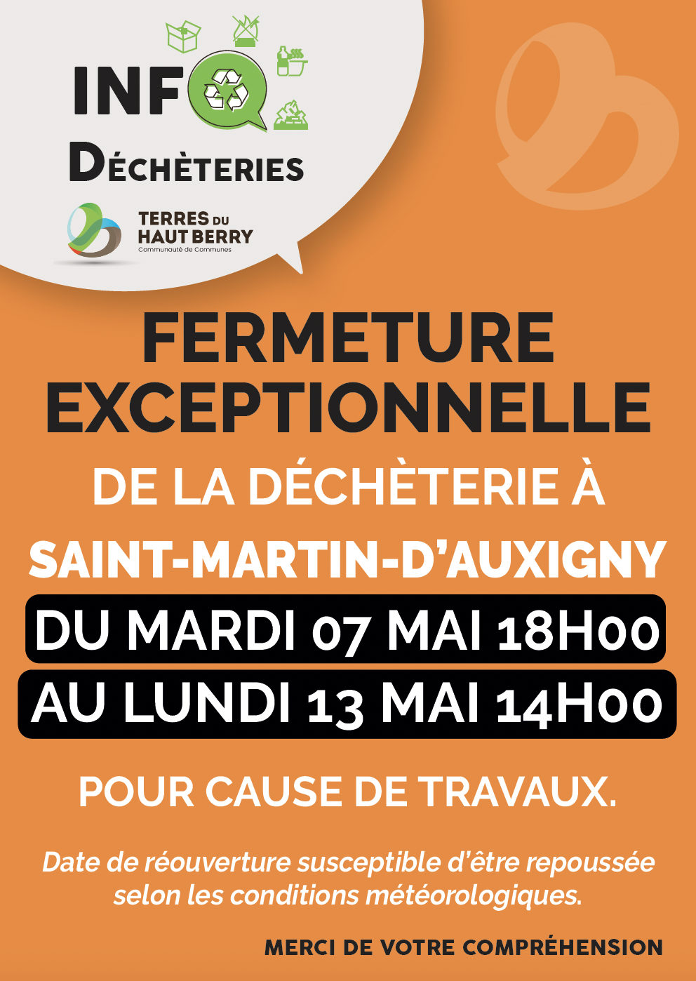 LA DÉCHÈTERIE DE SAINT-MARTIN-D’AUXIGNY SERA EXCEPTIONNELLEMENT FERMÉE DU MARDI 07 MAI 18H00 AU LUNDI 13 MAI 14H00 POUR CAUSE DE TRAVAUX. Date de réouverture susceptible d’être repoussée selon les conditions météorologiques.