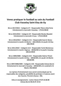 Né en 2007/2006/2005 – Catégorie U18 – Responsable Antony Barret Entrainement le mercredi à Vasselay – 18h30/20h et le vendredi à St