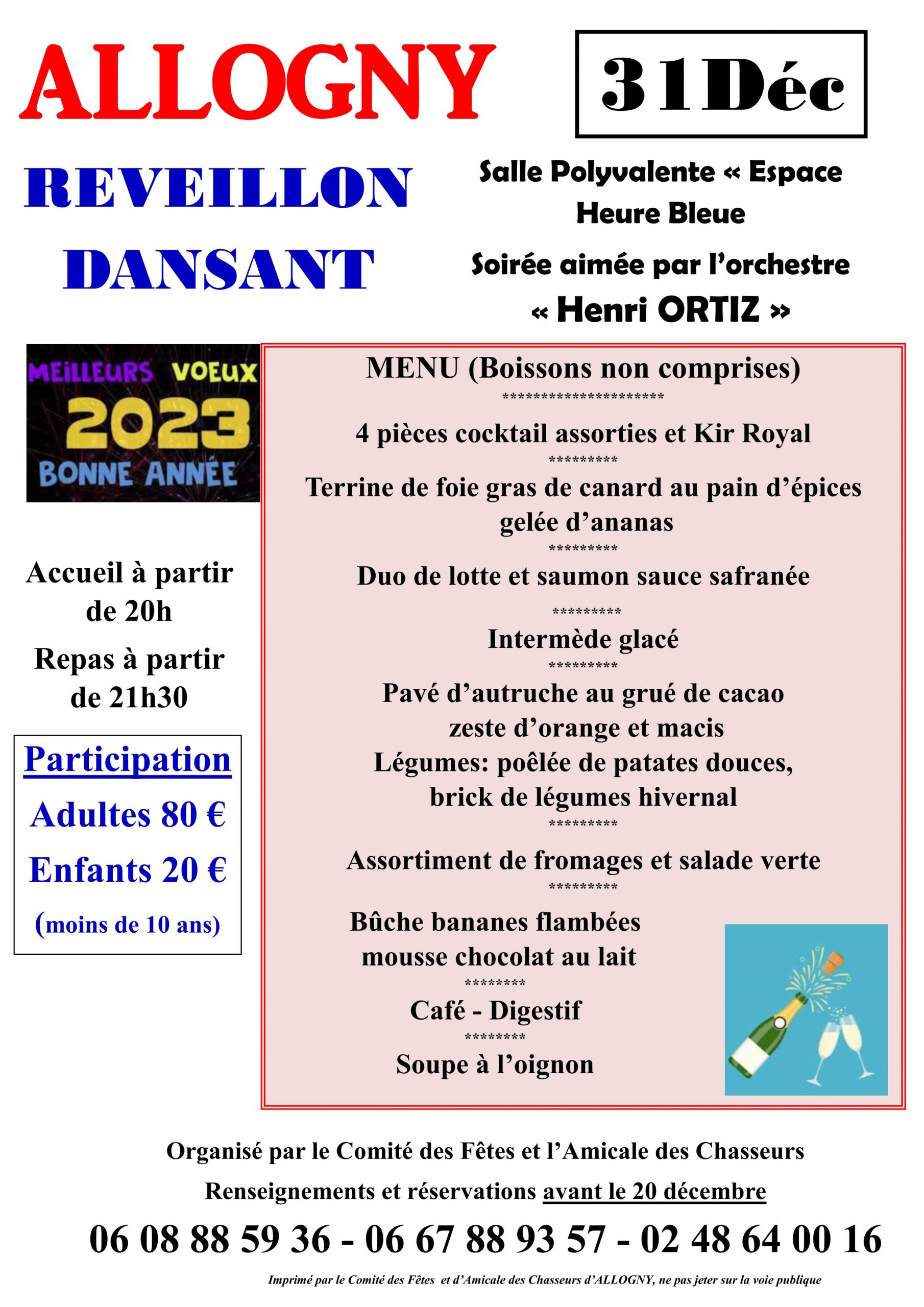 RÉVEILLON DANSANT : Soirée aimée par l’orchestre : « Henri ORTIZ ». Organisé par le Comité des Fêtes et l’Amicale des Chasseurs. Renseignements et réservations avant le 20 décembre 2022 : 06 08 88 59 36 - 06 67 88 93 57 - 02 48 64 00 16